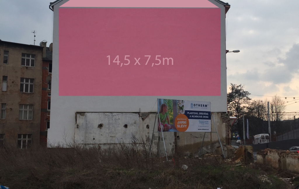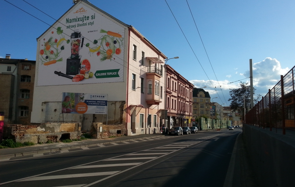 Štít budovy v centru Teplic vhodný pro banner. Rozměr plachty: 13.8x11.4m Plocha je dobře viditelná z frekventované ulice Na Hrázi, nedaleko teplického hlavního nádraží. Štít je kolmý na směr jízdy.